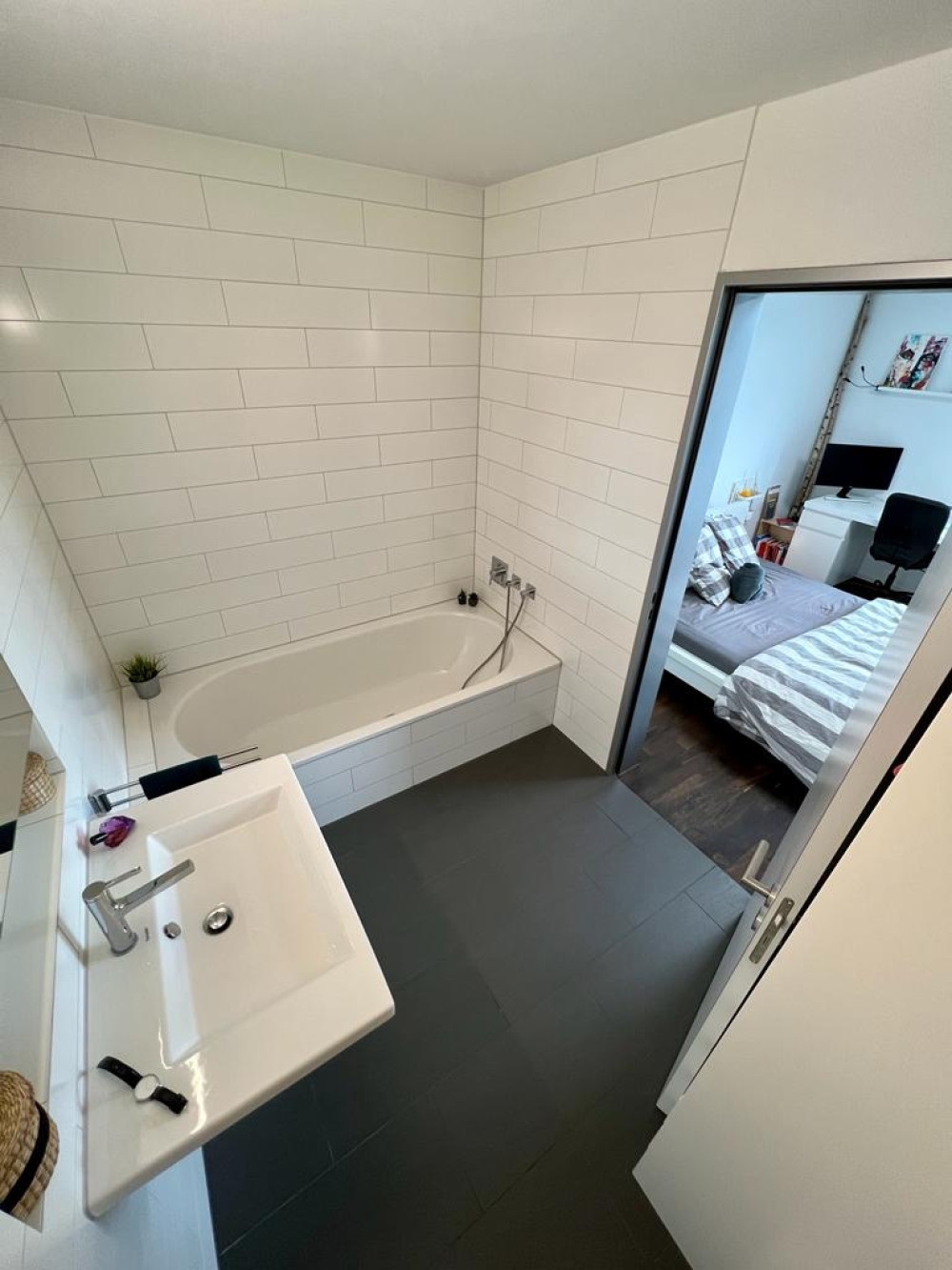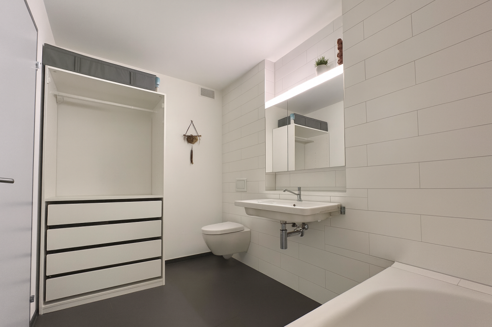 Die Wohnung verfügt über insgesamt 3 ½ Zimmer und bietet somit genügend Platz für eine Familie oder ein Paar. Es gibt zwei Badezimmer, von denen das Ensuite Bad mit einer Badewanne ausgestattet ist und das zweite Badezimmer über eine Dusche verfügt.