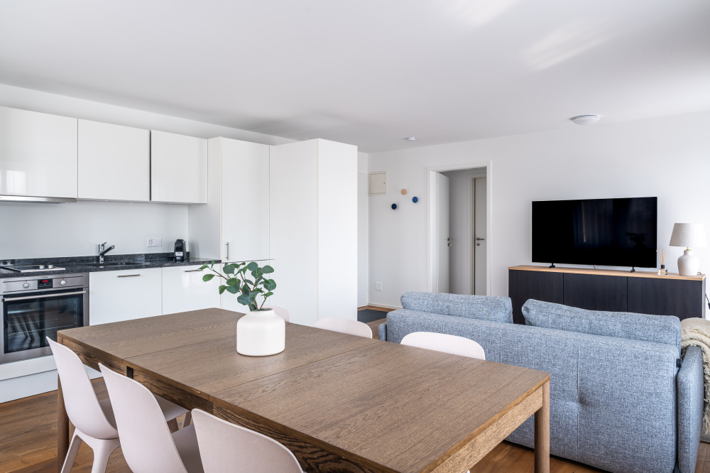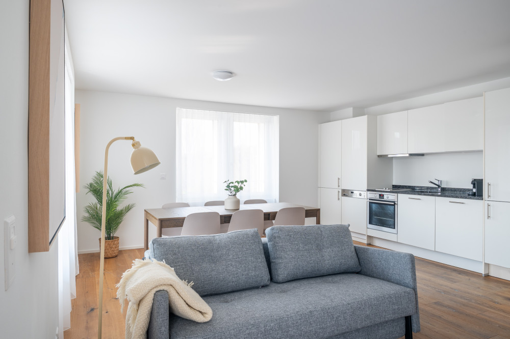 Der Wohnbereich wirkt durch die grosszügigen Fensterfronten hell und leicht. Helle Materialien, warme Holzböden und eine moderne, zurückhaltende Möblierung schaffen eine angenehme, unaufgeregte Atmosphäre. Der Essbereich ist harmonisch integriert, während die Küche funktional und klar gestaltet ist.
