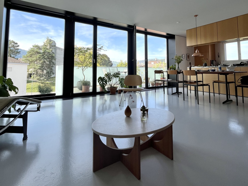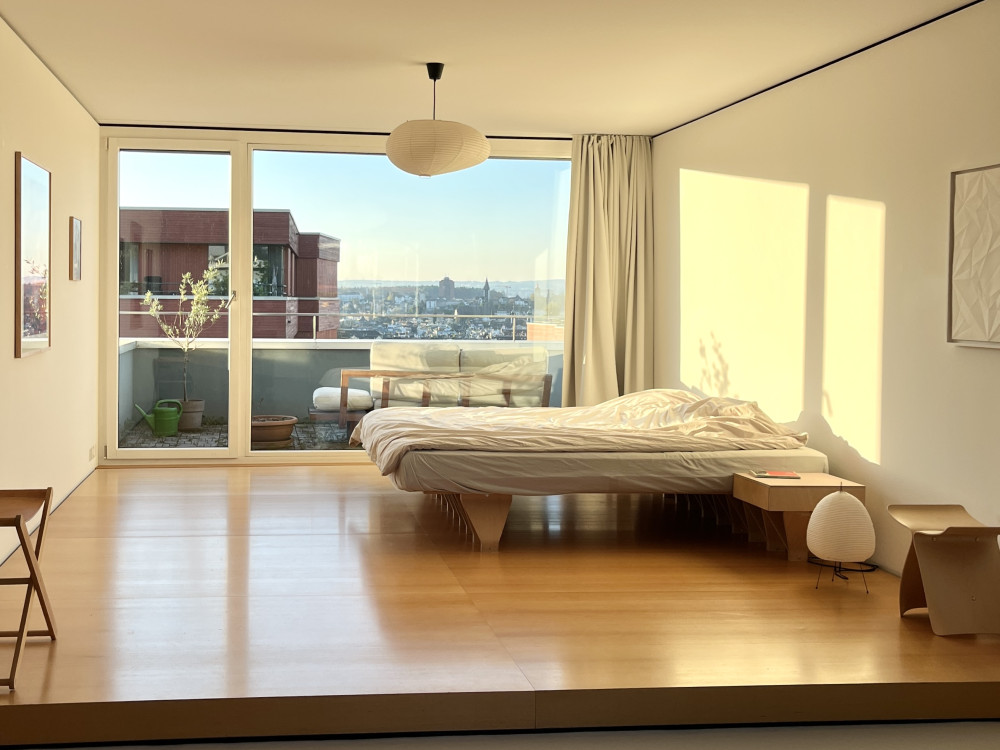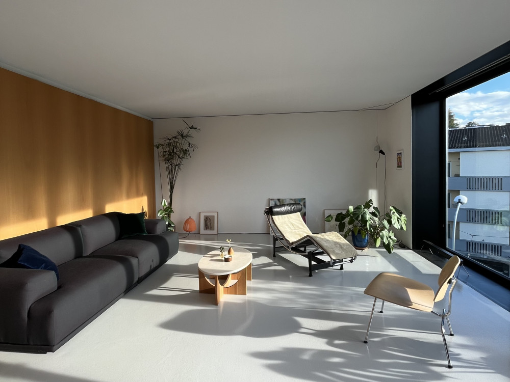 Diese hochwertig möblierte 1.5-Zimmer-Dachwohnung mit 91 m² Wohnfläche vereint minimalistisches Design, lichtdurchflutete Räume und stilvolle Architektur zu einem ganz besonderen Wohngefühl. Die möblierte Wohnung besticht durch ihre offene Raumstruktur, eine elegante Wohnküche mit edler Holzverkleidung und hochwertigen Geräten sowie einen grosszügigen Wohn- und Essbereich mit raumhohen Fensterfronten, die viel Licht hereinlassen und einen fliessenden Übergang zu einem der beiden grosszügigen Balkone schaffen. Der Schlafbereich liegt leicht erhöht auf einem Podest mit direktem Zugang zum zweiten Balkon – ideal, um in der Morgensonne zu frühstücken oder abends den Blick über die Stadt schweifen zu lassen. Im Wohnbereich sorgen eine integrierte Bibliothek und ausgesuchte Designmöbel für eine ruhige, stilvolle Atmosphäre. Das Badezimmer überzeugt mit einem markanten, in Blau gehaltenen Design und einem Dachfenster, das eine einzigartige Lichtstimmung erzeugt. Die möblierte Wohnung wurde mit viel Liebe zum Detail ausgestattet und bietet ein hochwertiges Wohngefühl mit maximalem Komfort.